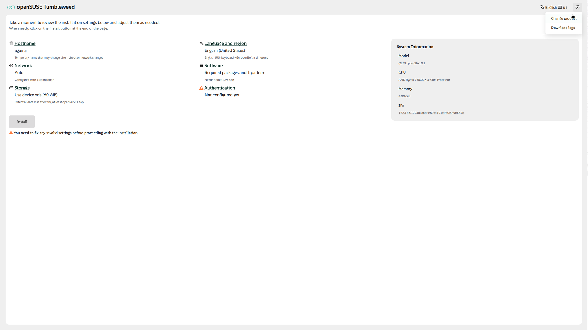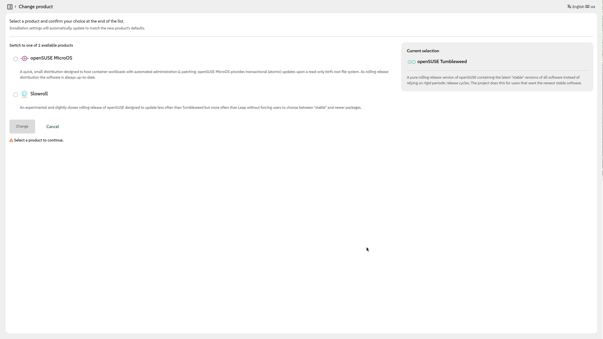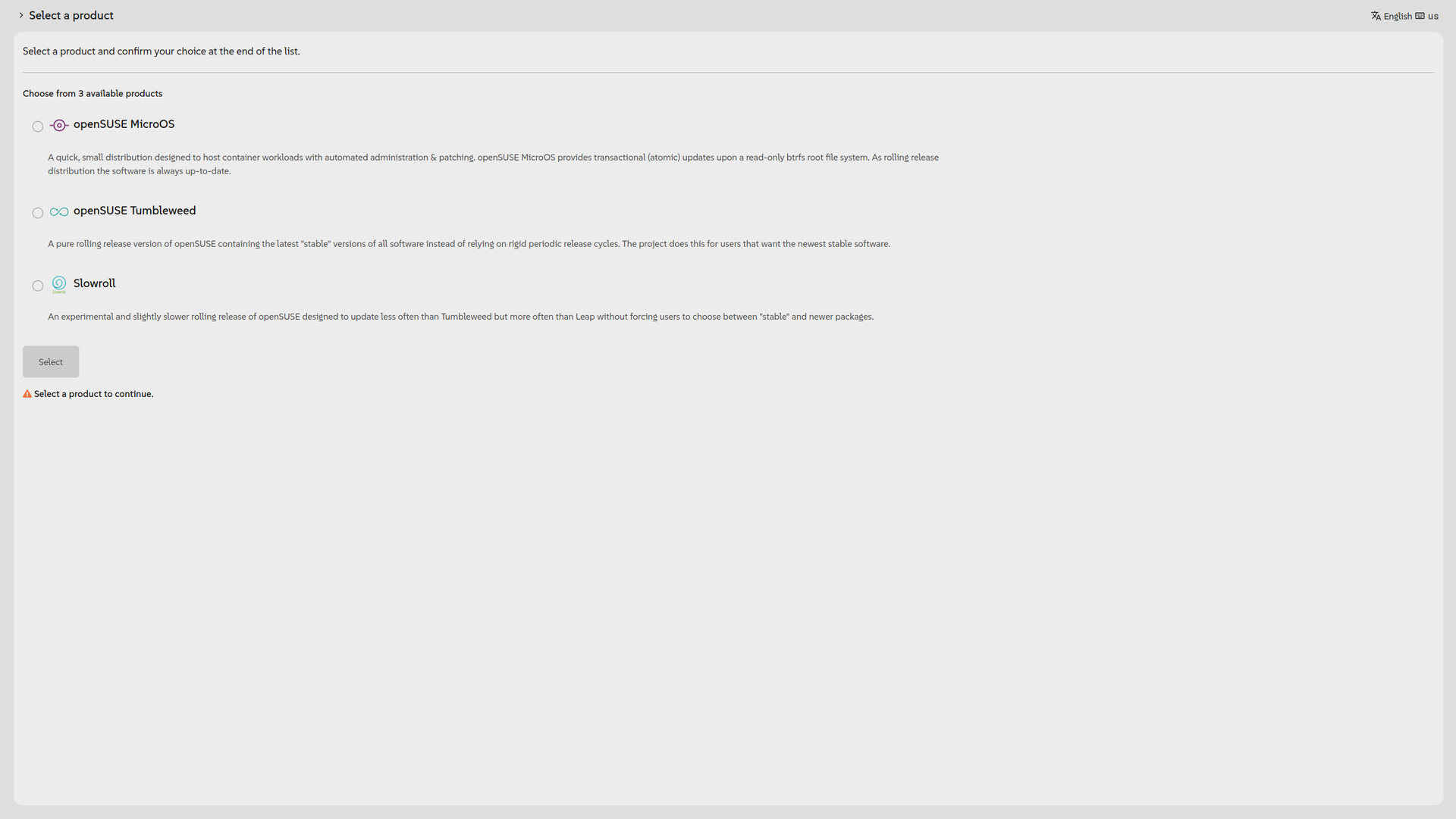 Agama permite seleccionar qué producto se quiere instalar. En este caso tenemos un instalador para MicroOS, Slowroll y Tumbleweed. MicroOS viene para instalaciones en servidor sin sistema gráfico, así que selecciona Slowroll o Tumbleweed. La instalación será igual en ambos casos.