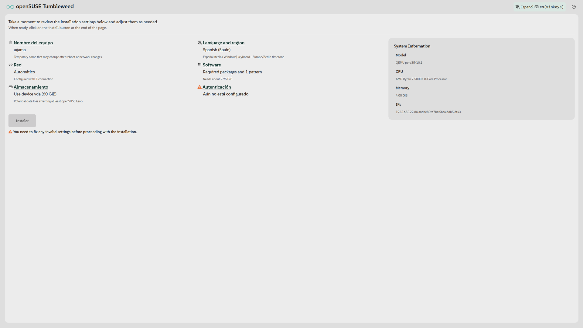 El botón Instalar no está disponible y un warning justo debajo nos advierte de que falta algo importante. Otro warning nos indica qué cosas hay que hacer antes de poder instalar nada; en este caso, falta por definir una cuenta usuaria por lo menos.