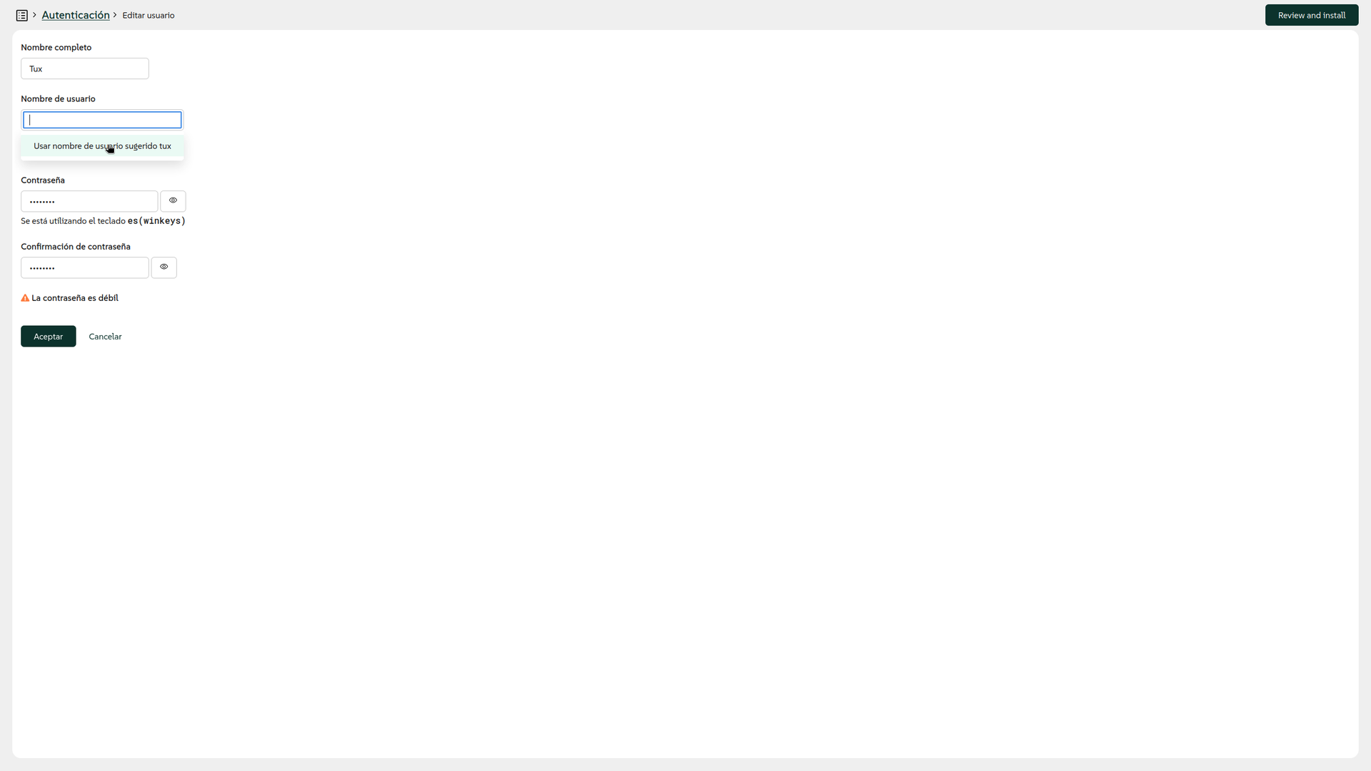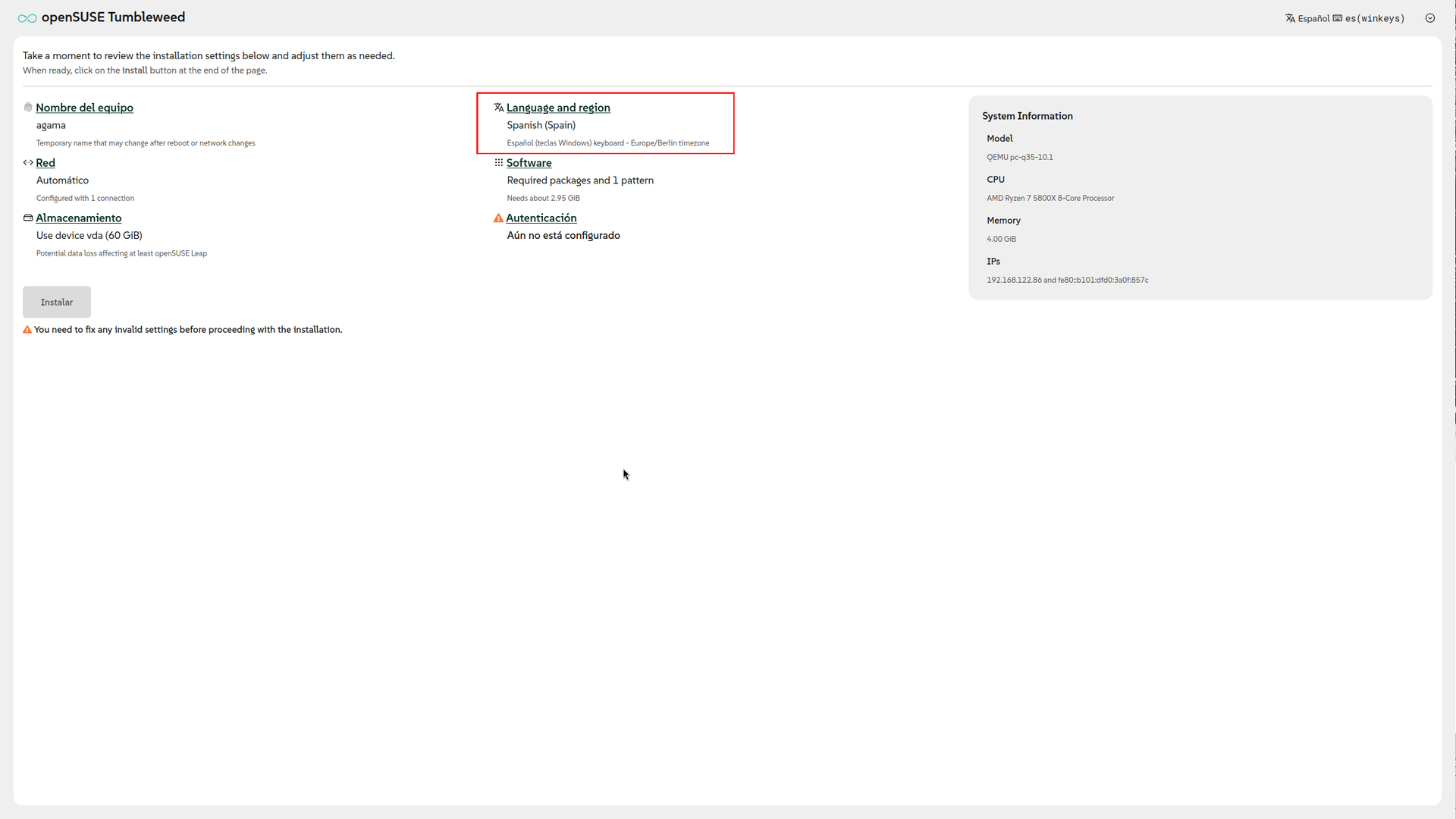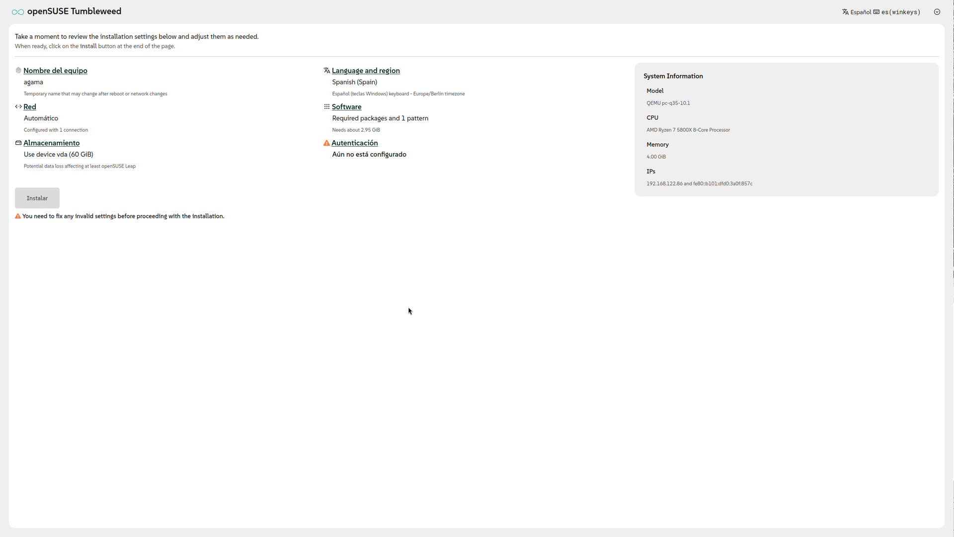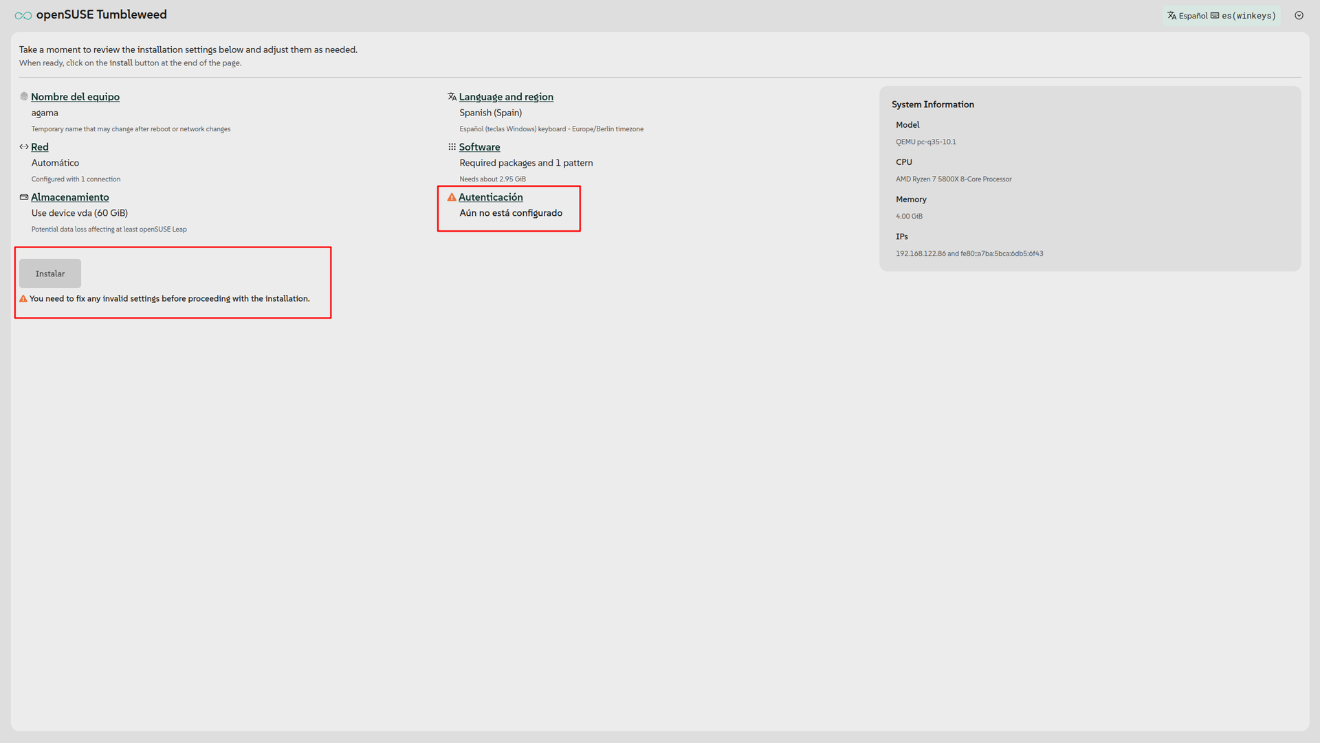 El botón Instalar no está disponible y un warning justo debajo nos advierte de que falta algo importante. Otro warning nos indica qué cosas hay que hacer antes de poder instalar nada; en este caso, falta por definir una cuenta usuaria por lo menos.