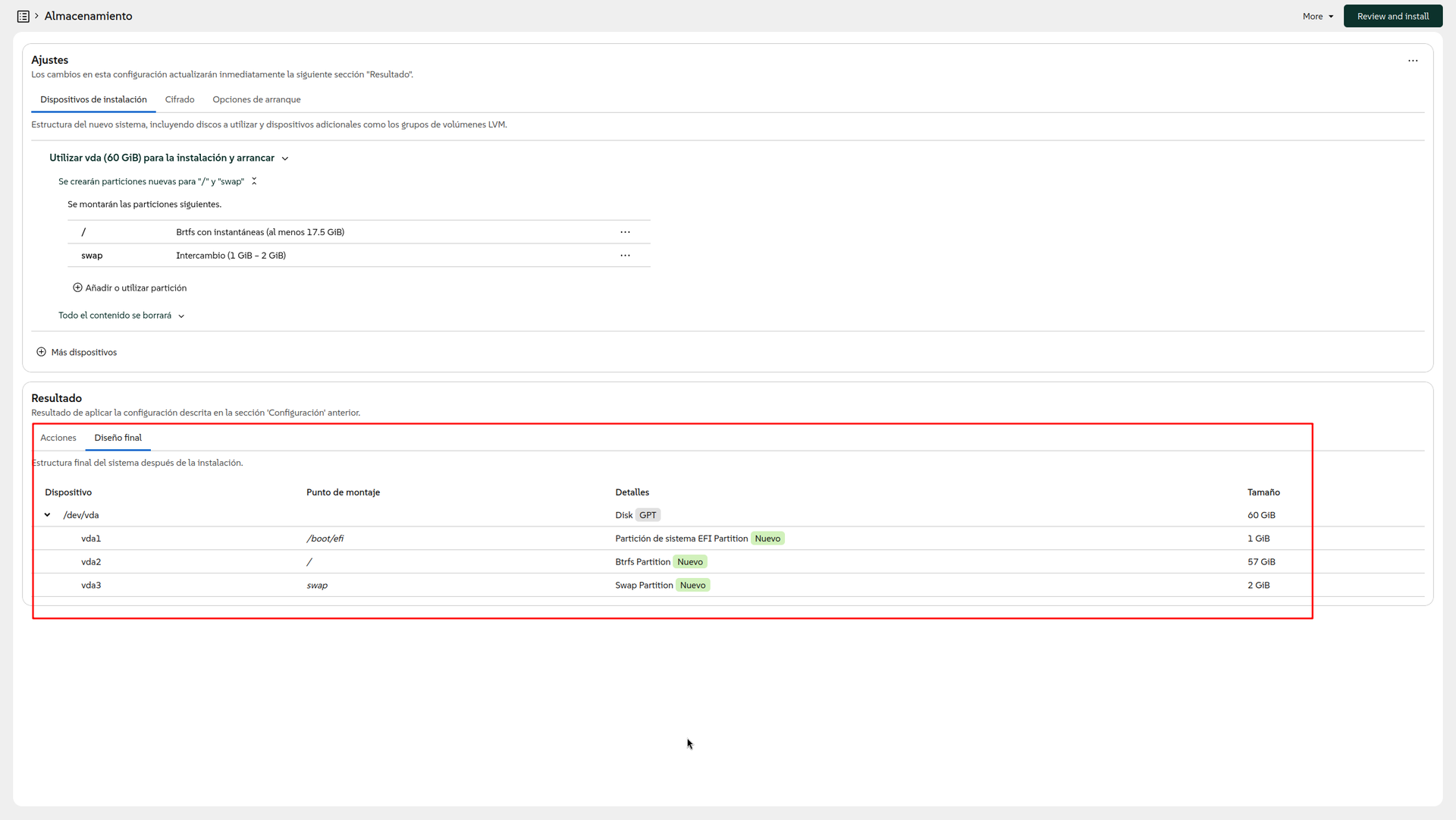 Podemos pinchar en Autentificación para  definir un a cuenta usuaria que permitiría comenzar a usar el sistema tal cual, pero eso no significa que hayamos hecho todos los cambios en la instalación necesarios. En esta instalación, falta por añadir el sistema gráfico, y si usas Windows y quieres conservarlo, tendrías que modificar el particionado ya que por defecto borrará todo el contenido del disco.