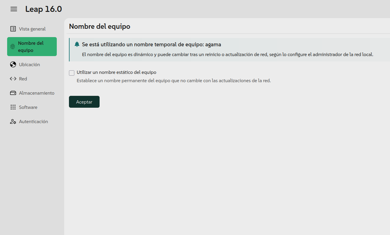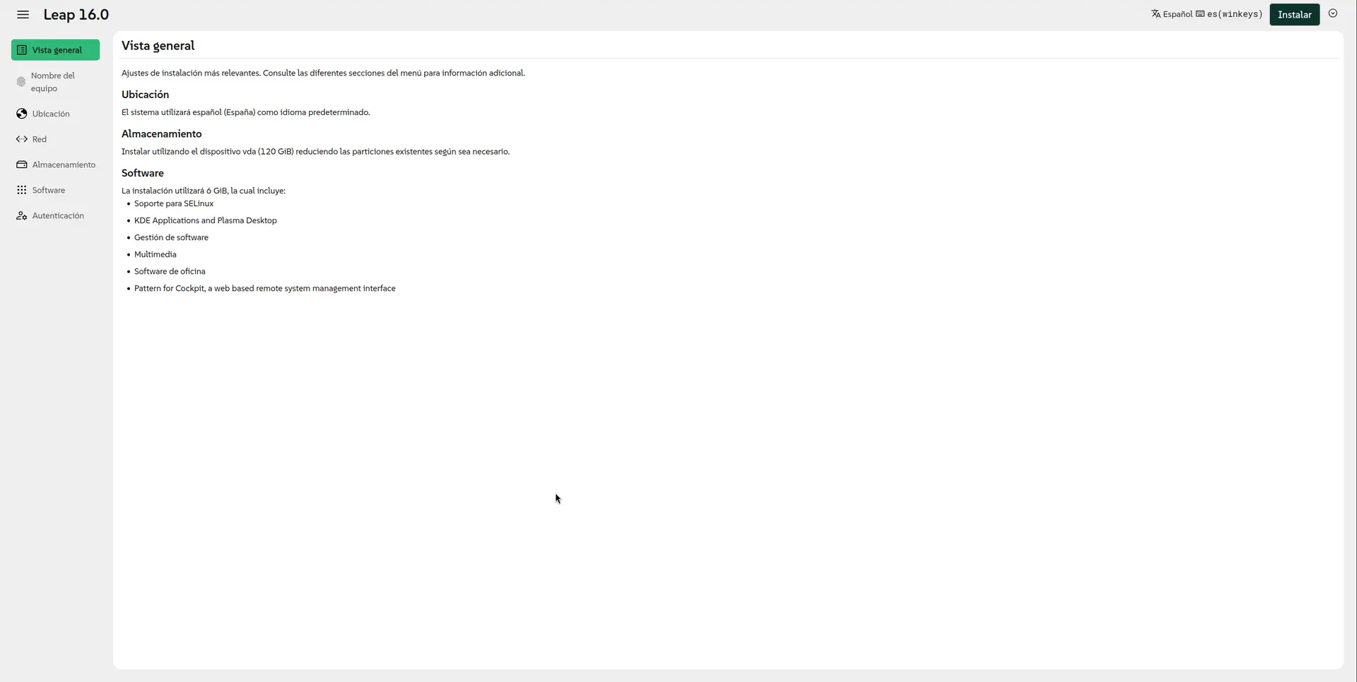 Leap 16.0: es la distribución clásica que estamos instalando. Más adelante podrás seleccionar grupos de software según el uso que le quieras dar: escritorios gráficos, herramientas de servidor, etc.