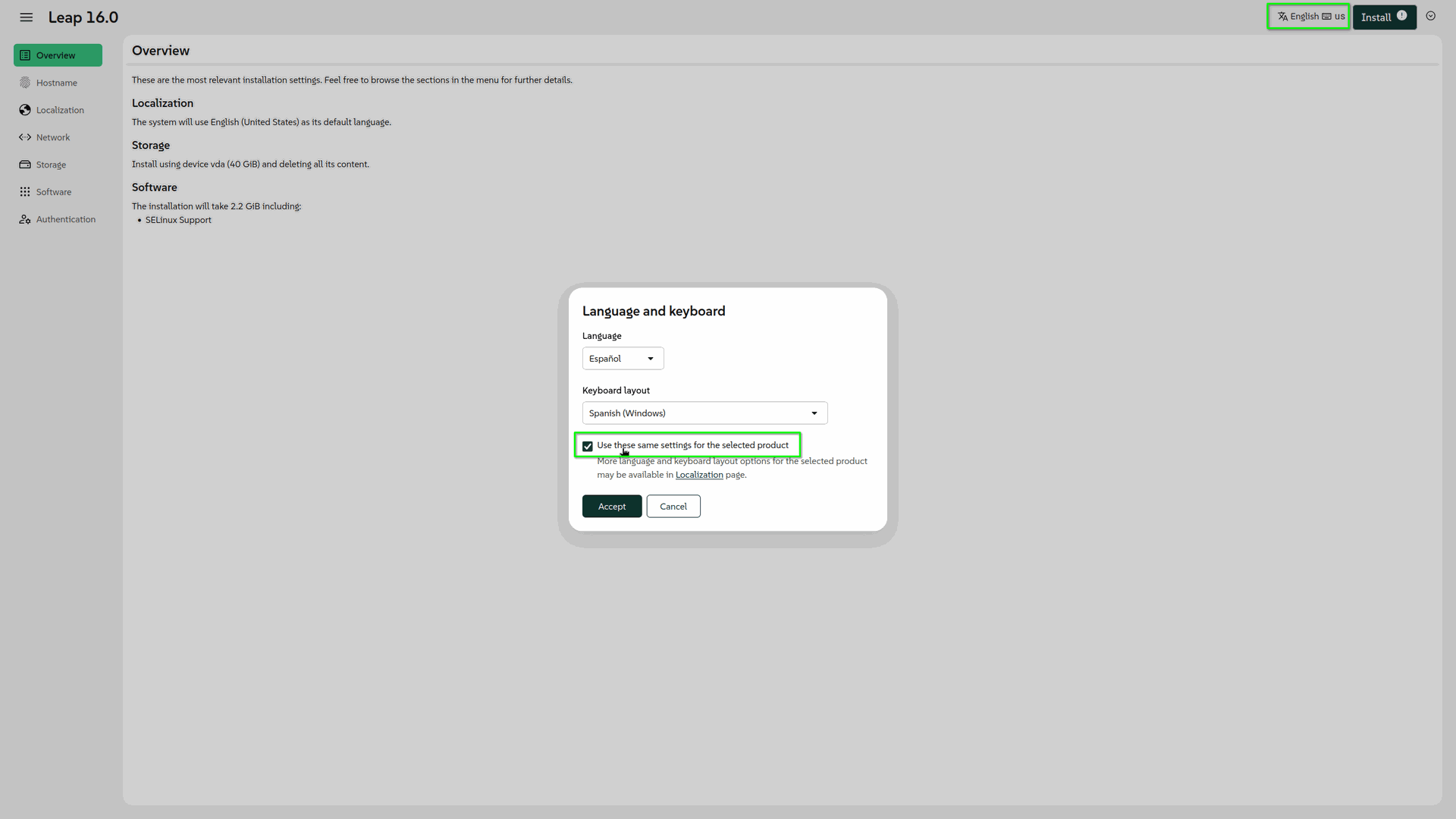 Si ya hemos seleccionado el producto habrá una opción para seleccionar si queremos que esa selección aplique también al sistema una vez instalado.